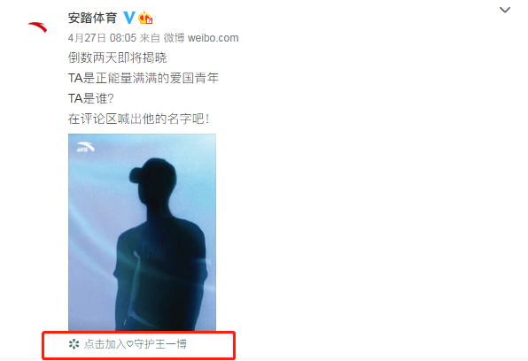 從安踏品牌方公布的代言人剪影,以及“點擊加入守護王一博”(明星經(jīng)紀(jì)公司)的標(biāo)簽上來看,最新代言人應(yīng)該是王一博沒錯了。