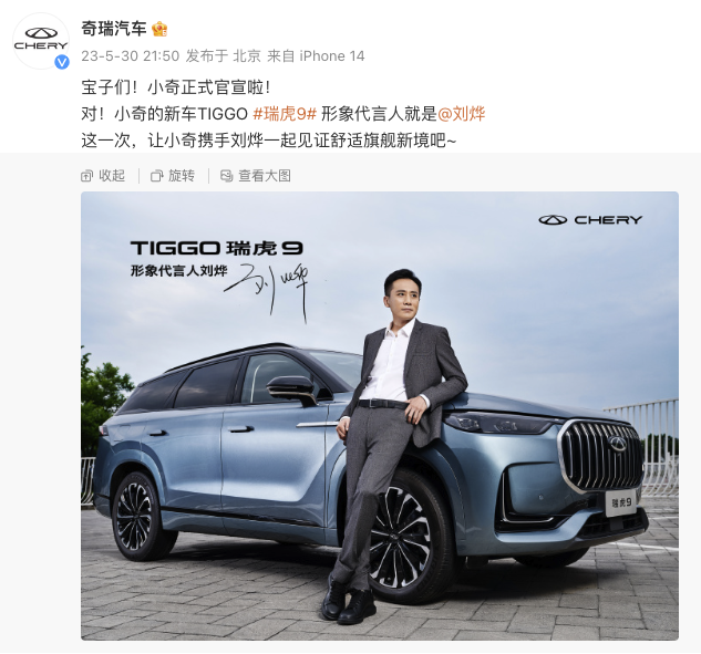 奇瑞汽車官宣劉燁為瑞虎9形象代言人