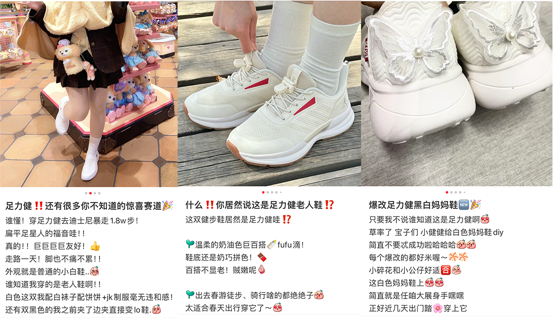 在過去的十年里,足力健憑借其卓越的產(chǎn)品品質(zhì)和精準(zhǔn)的市場定位,在老年人群中贏得了廣泛的贊譽(yù),穩(wěn)坐老人鞋行業(yè)“頭把交椅”。然而,足力健并未止步于此,而是敢于“擴(kuò)圈”,通過老人鞋來觸動(dòng)年輕消費(fèi)者的心。在小紅書上搜索“足力健”“爆改足力健黑白媽媽鞋”“跟風(fēng)diy足力健好看到了心巴”“足力健爆改瑪麗珍”等話題和調(diào)侃收獲了眾多互動(dòng)。足力健通過差異化的內(nèi)容運(yùn)營,萃取獨(dú)特的產(chǎn)品元素,對(duì)原有風(fēng)格進(jìn)行再創(chuàng)新,從而精準(zhǔn)地與不同屬性的人群溝通。讓年輕人覺得穿足力健是時(shí)尚、也是潮流。在新的價(jià)值觀體系上,足力健構(gòu)建了更符合當(dāng)下時(shí)代的獨(dú)特話語體系,成功破圈年輕群體,贏得了更多年輕消費(fèi)者的認(rèn)同。
