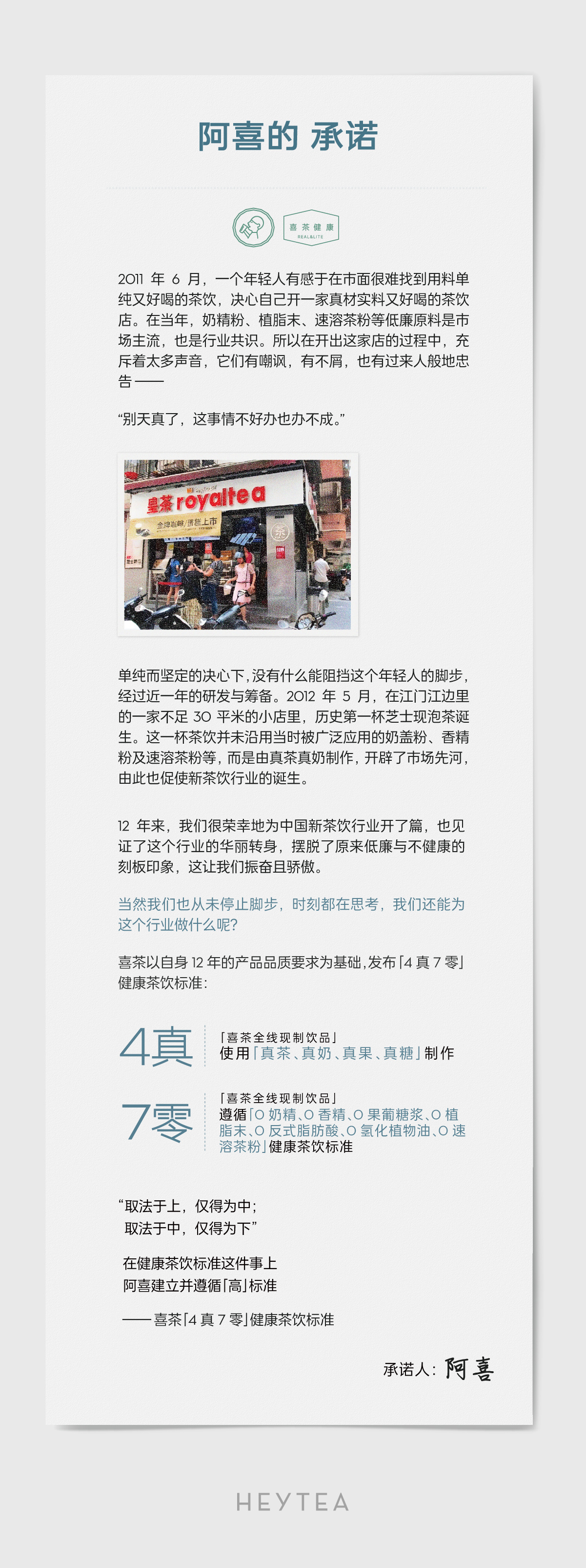 自 2012 乃年喜茶誕生以來,便始終堅持以真茶真奶之作。近日,喜茶決定以自身 12 年的產(chǎn)品品質(zhì)要求為基礎(chǔ),發(fā)布「4 真 7 零」健康茶飲標(biāo)準(zhǔn)并邀請中國標(biāo)準(zhǔn)化協(xié)會作為技術(shù)指導(dǎo)單位,把這個承諾制定成了喜茶《新茶飲 現(xiàn)制茶飲》企業(yè)標(biāo)準(zhǔn)進行了公開公示。在未來,喜茶將繼續(xù)走在不斷追求健康的路上,拉高「底線」,給大家提供更多更健康的選擇。