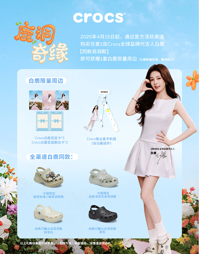 此次,白鹿同款的兩款洞洞鞋——搖滾玫瑰小鯨魚洞洞鞋、經(jīng)典泡芙花束洞洞鞋,皆為中國(guó)區(qū)限定鞋款。4 月 15 日-21 日,消費(fèi)者于 Crocs 天貓超級(jí)品牌日期間,在天貓官方旗艦店購(gòu)買白鹿同款洞洞鞋即可解鎖代言人專屬限量周邊。此外,4 月 20 日,代言人白鹿還會(huì)空降 Crocs 天貓官方旗艦店直播間為洞門人派發(fā)多重驚喜福利。