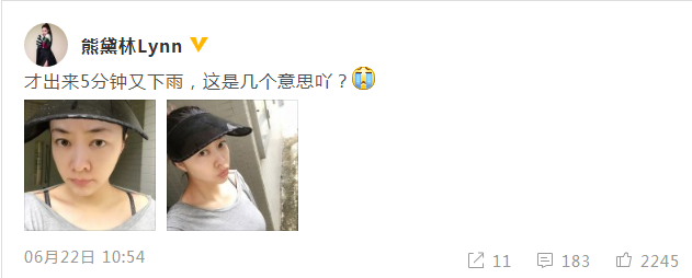 6月22日,熊黛林在自己微博上傳一組自拍,并配文稱:“才出來(lái)5分鐘又下雨,這是幾個(gè)意思吖?”照片中的她素顏出鏡,身穿灰色運(yùn)動(dòng)上衣,嘟嘴賣萌,頭戴遮陽(yáng)帽。帽檐上有很多水珠,整個(gè)場(chǎng)景看起來(lái)灰蒙蒙的,應(yīng)該是正在下雨。