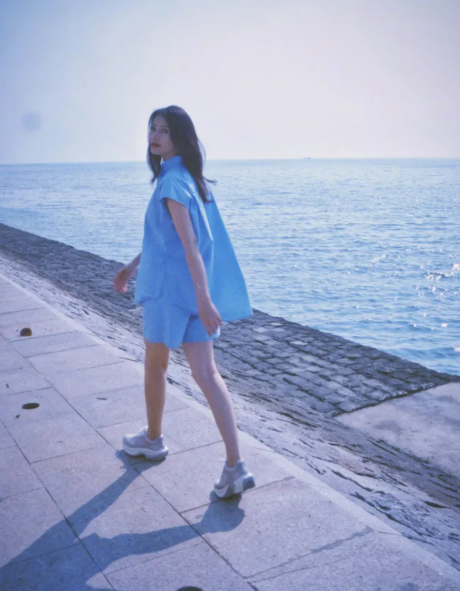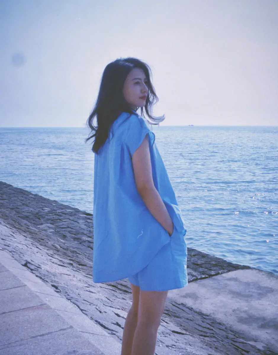 高圓圓穿藍(lán)色連衣裙和海邊適配度拉滿。