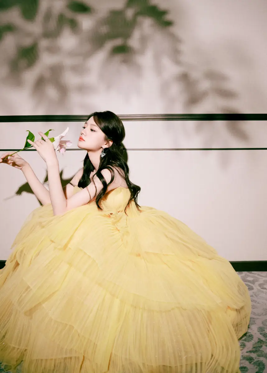 任敏穿黃色抹胸裙甜美動(dòng)人 手捧鮮花盡顯少女情懷