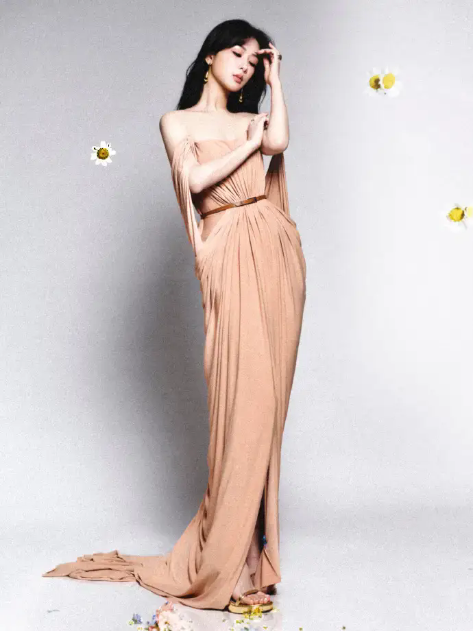 楊紫身穿咖色抹胸裙,展現(xiàn)骨架美