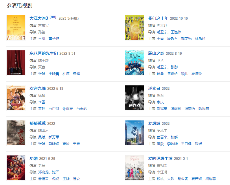 代表作品:歡樂頌、生死線、刀客家族的女人、神犬奇兵、歸還世界給你、大江大河、我們都要好好的、愛在左,情在右