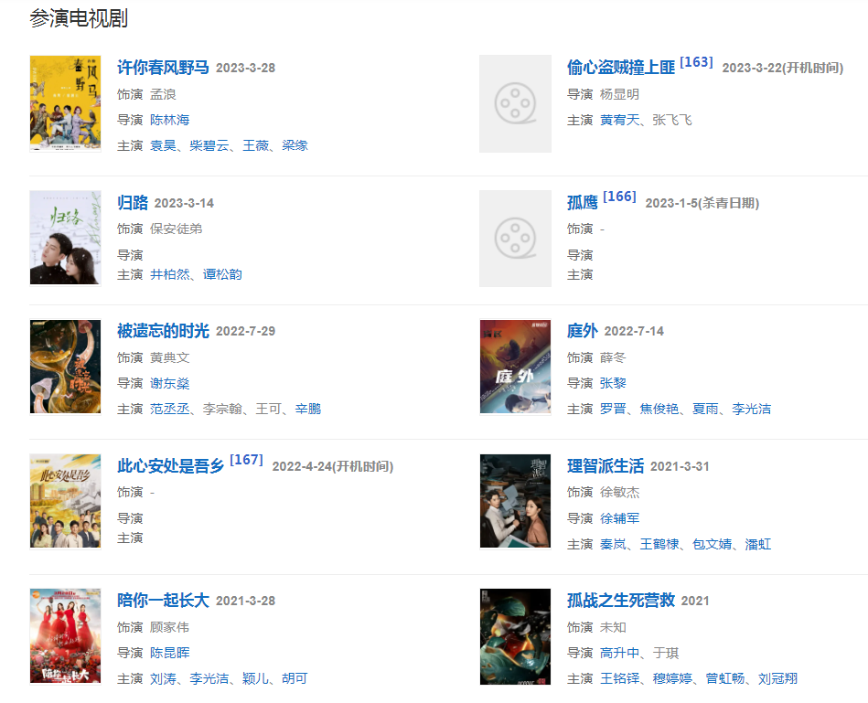 代表作品:梧桐雨、徽娘宛心、還君明珠、春去春又回、戀愛先生、精英律師、如果歲月可回頭、安家