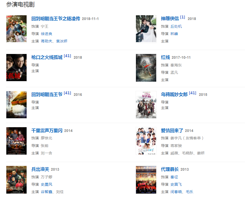 2016年主演古裝劇《贏天下》和《回到明朝當王爺之楊凌傳》。