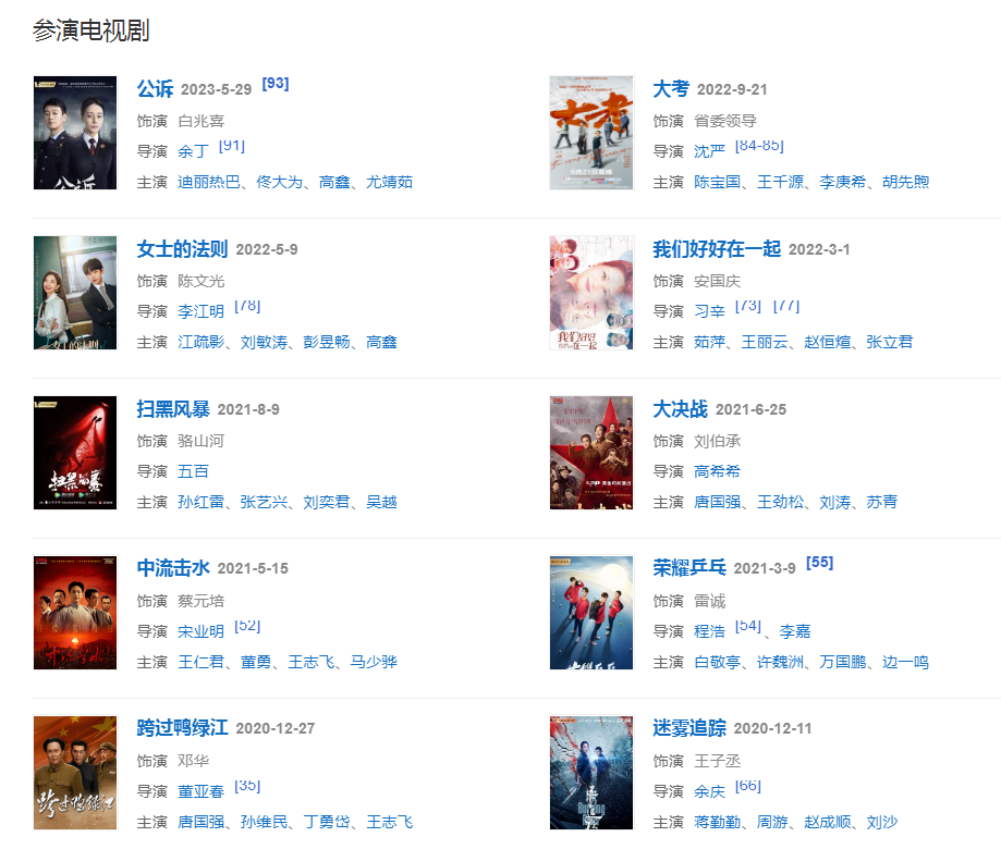 2020年,出演的抗疫題材電視劇《最美逆行者》和革命歷史題材劇《跨過(guò)鴨綠江》先后在央視一臺(tái)播出。