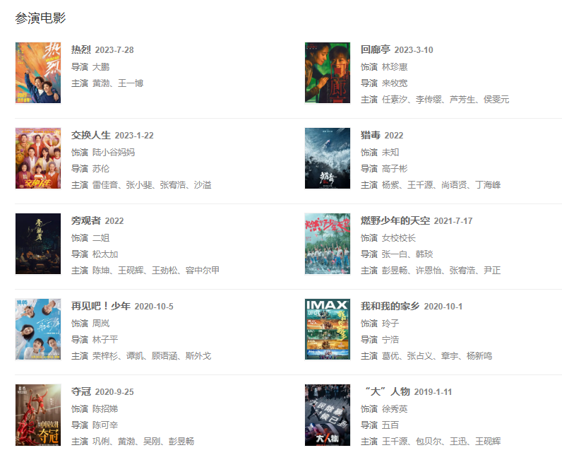 2021年7月,領(lǐng)銜主演犯罪懸疑片《回廊亭》 ;同年,憑借電影《再見吧!少年》提名第34屆中國電影金雞獎最佳女主角 。