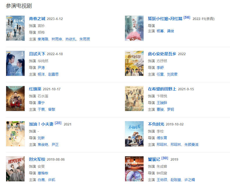 202186日,參演的熱血青春勵志劇《烈火軍?!凡コ觯趧≈酗椦莅馋?;915日,搭檔曹駿主演的當代農(nóng)村劇《在希望的田野上》在騰訊視頻播出,在劇中飾演卞筱悅;1017日,主演的大型史詩電視劇《紅旗渠》播出,在劇中飾演鐵姑娘隊隊長石水蓮。