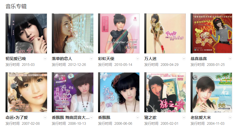 代表作品:豬之歌、香飄飄、初見(jiàn)愛(ài)已晚、就算沒(méi)有如果、搖籃曲、一盆眼淚、命運(yùn)、追、煉凝香
