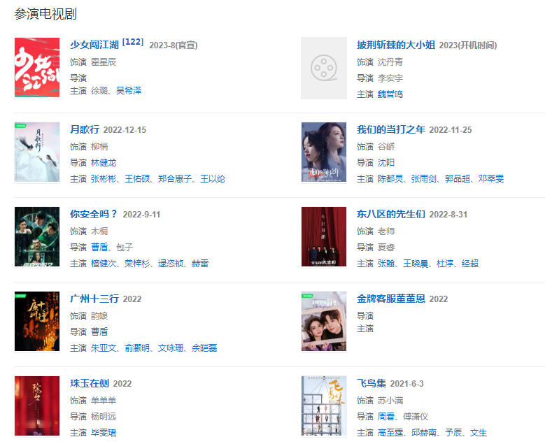 代表作品:閃光少女、甄嬛傳、海上牧云記、高興遇見你、天衣無(wú)縫、長(zhǎng)安十二時(shí)辰、愛上北斗星男友、良辰美景好時(shí)光、若你安好便是晴天、風(fēng)聲