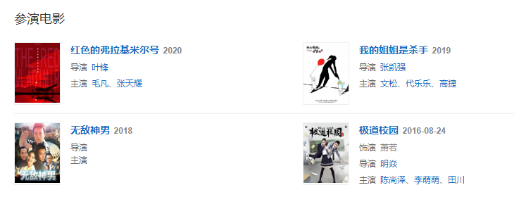 2016年,領(lǐng)銜主演明焱執(zhí)導(dǎo)喜劇電影《極道校園》,在片中飾演學(xué)校醫(yī)務(wù)室的青年女醫(yī)師蕭若。