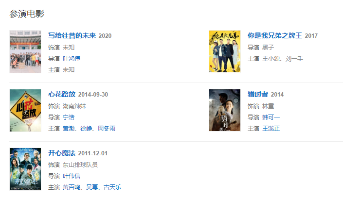 2015年,主演懸疑劇《笨蛋愛上兩個(gè)你》;同年,她還主演了青春劇《十五年等待候鳥》 。