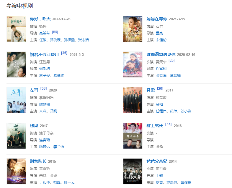 2016年,參演正風反腐題材電視劇《脊梁》,飾演市委組織部長韓楚霞;參演網(wǎng)絡劇《秘果》,飾演女主角池子的母親 。