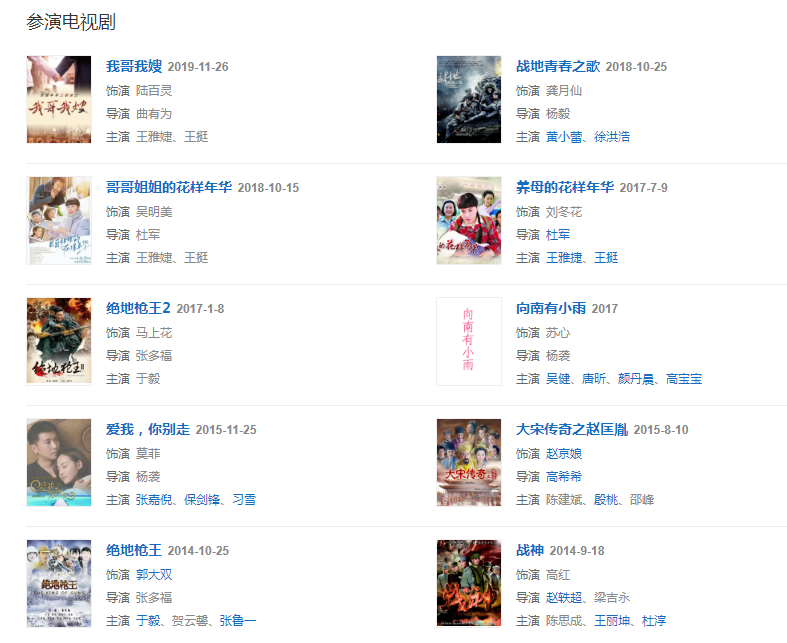 2017年,出演楊襲執(zhí)導的現(xiàn)代劇《向南有小雨》。2019年,出演都市情感劇《哥哥姐姐的花樣年華》 。