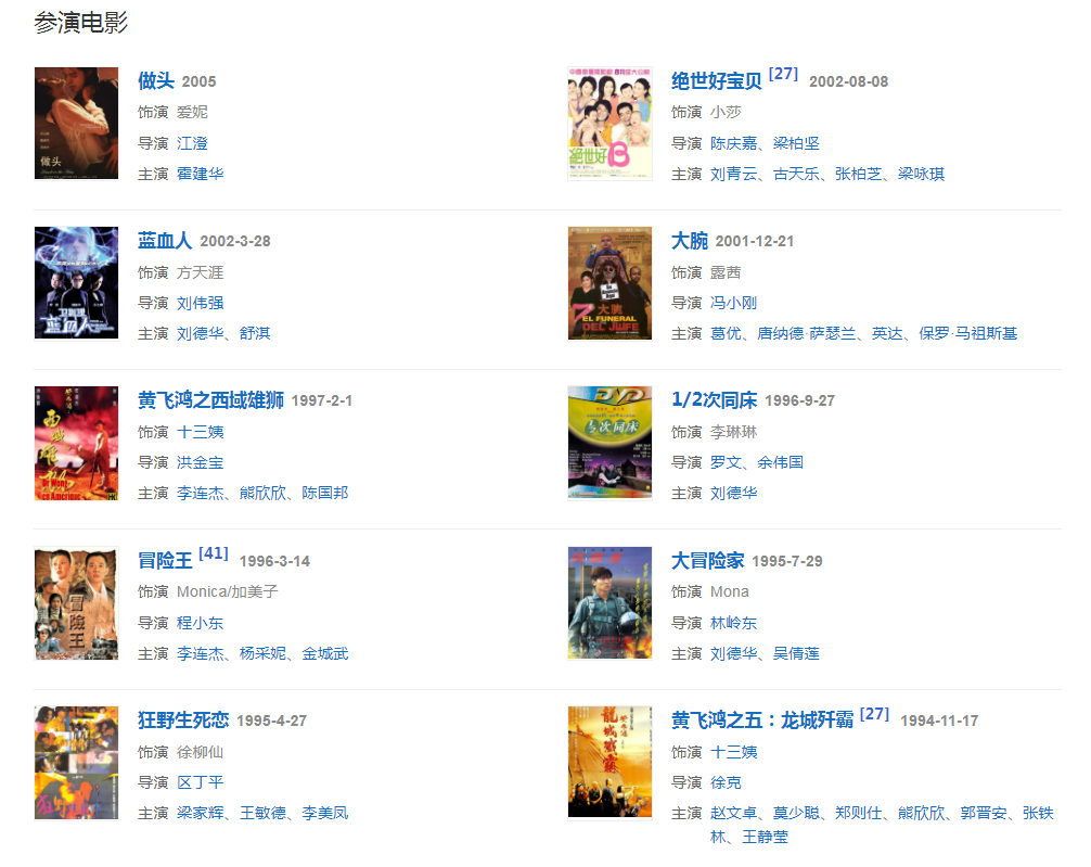 代表作品:黃飛鴻之一壯志凌云、黃飛鴻之二男兒當(dāng)自強(qiáng)、黃飛鴻之三:獅王爭(zhēng)霸、笑傲江湖Ⅱ:東方不敗、冒險(xiǎn)王