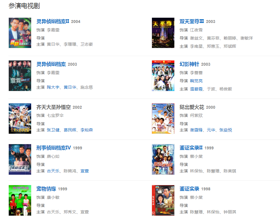 代表作品:鑒證實錄、刑事偵緝檔案IV、致命密函、江湖告急、五鼠斗御貓