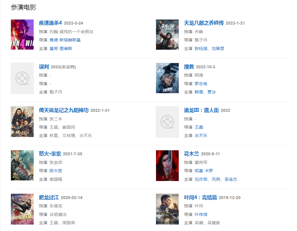 2022年1月31日,出演《倚天屠龍記之九陽(yáng)神功》。同年5月,甄子丹監(jiān)制及主演的電影《天龍八部之喬峰傳》在戛納驚艷亮相。