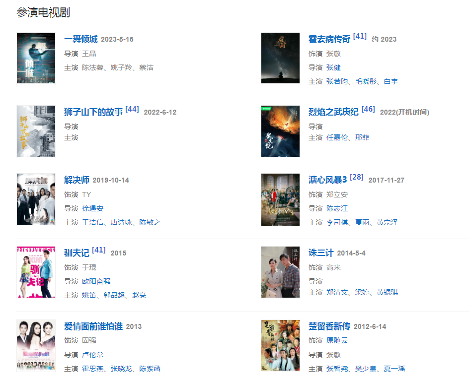 代表作品:特戰(zhàn)先鋒、絕地蒼狼、轉(zhuǎn)世驚情、陀槍師姐、新包青天、十月初五的月光、楚留香新傳、新少林五祖、火蝴蝶、紫宅、繡花鞋