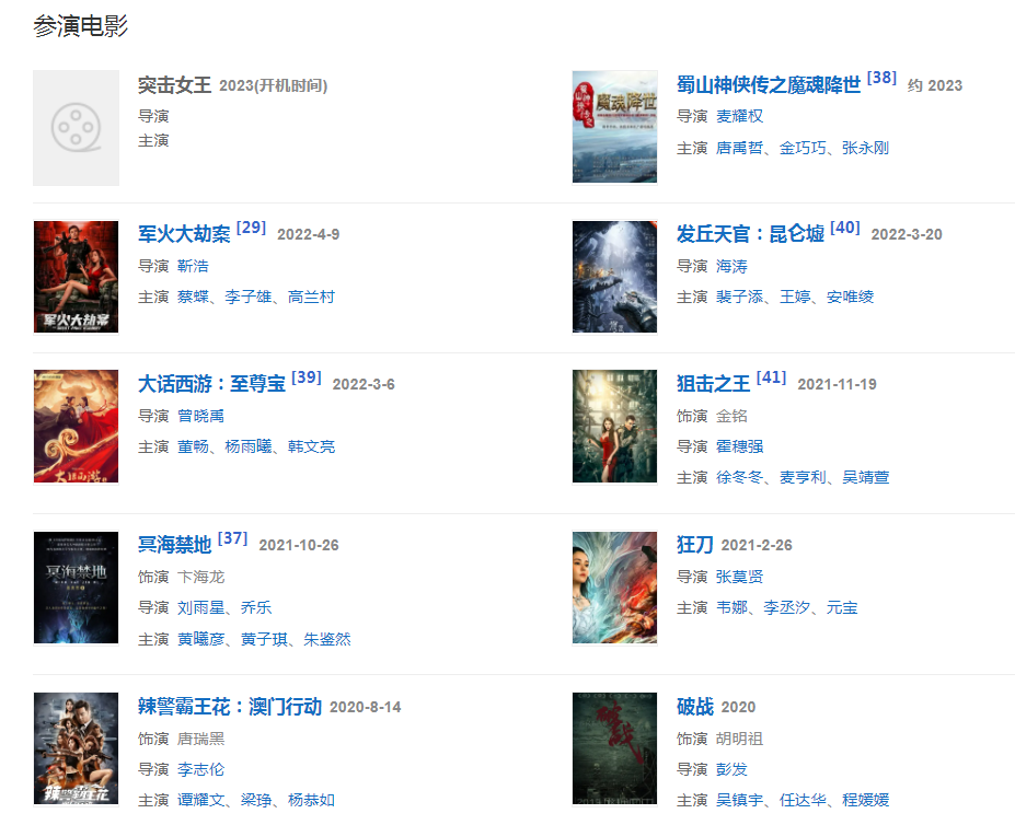 2022年3月6日,主演的奇幻愛情電影《大話西游:至尊寶》在騰訊視頻獨家上映; [39] 3月20日,主演的盜墓動作探險電影《發(fā)丘天官:昆侖墟》上映; 4月9日,主演的動作電影《軍火大劫案》在騰訊視頻上映。