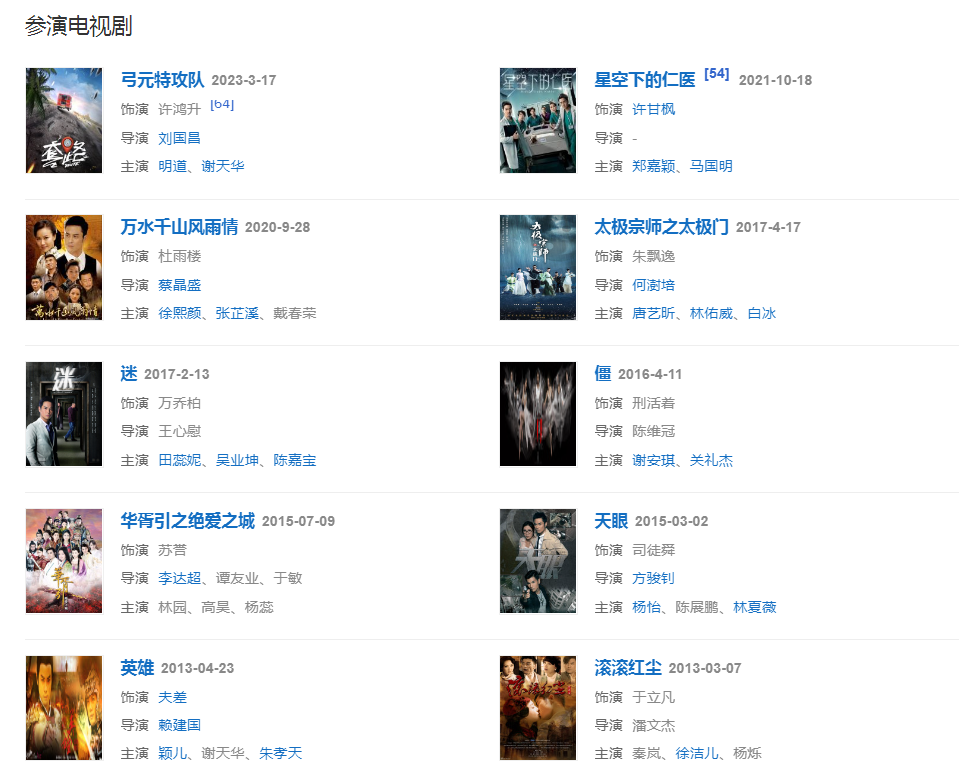 代表作品:天幕下的戀人、與敵同行、烈火雄心3、怒火街頭、步步驚心、僵